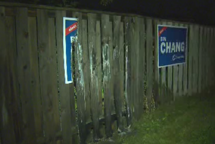 At least two signs were set ablaze while they were hanging from wooden fences located on Warden Avenue just south of Bamburgh Circle in Scarborough.