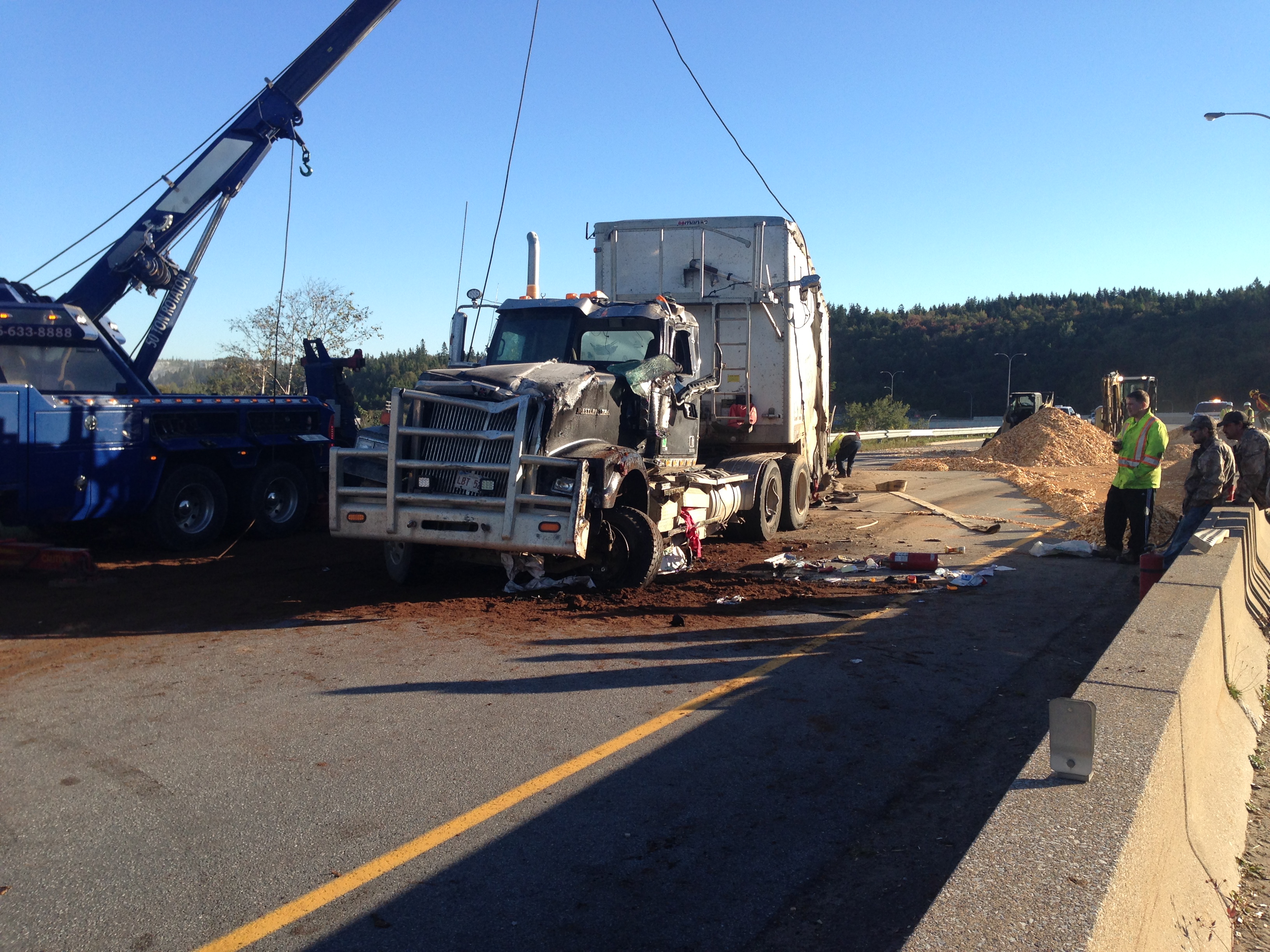 SAINT JOHN – A chip truck that overturned early Friday morning has caused the closure of both the west and east bound lanes of Highway 1 at the Rothesay Avenue overpass.