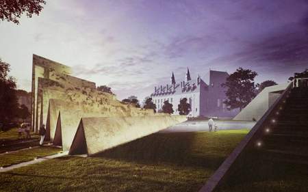 The design by Toronto-based Abstrakt Studio Architecture features a series of angular peaks, or “memory folds,” with more than 100 million pixel-like “memory squares” — each representing a person — covering the exterior face of the folds. The initial idea was to have the folds depict a mural of dead bodies when viewed from a distance. The design also includes a Bridge of Hope and elevated viewing platform.