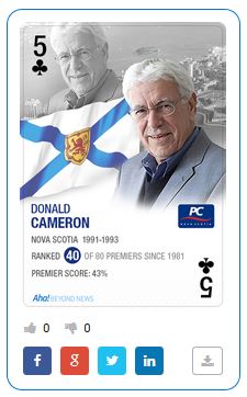 HALIFAX – A Vancouver-based think-tank’s ranks former Nova Scotia premier Donald Cameron 40th out of 80 premiers across the country.
