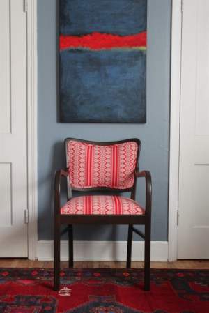 Her favourite part is textile selection and searching for out-of-the-ordinary fabrics. She’s upholstered furniture with curtain panels, tablecloths and embroidery. She upholstered a dining-room chair with her mother’s crewel artwork. She’s currently reupholstering two chairs with old quilts.