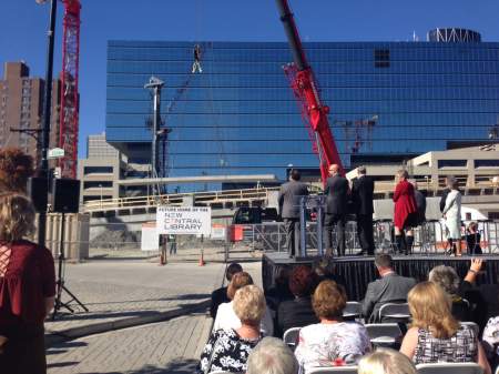 Dignitaries and onlookers applauded the cement slab swinging into place as it signified a new phase in construction for the central library that will be built around and above the railway.