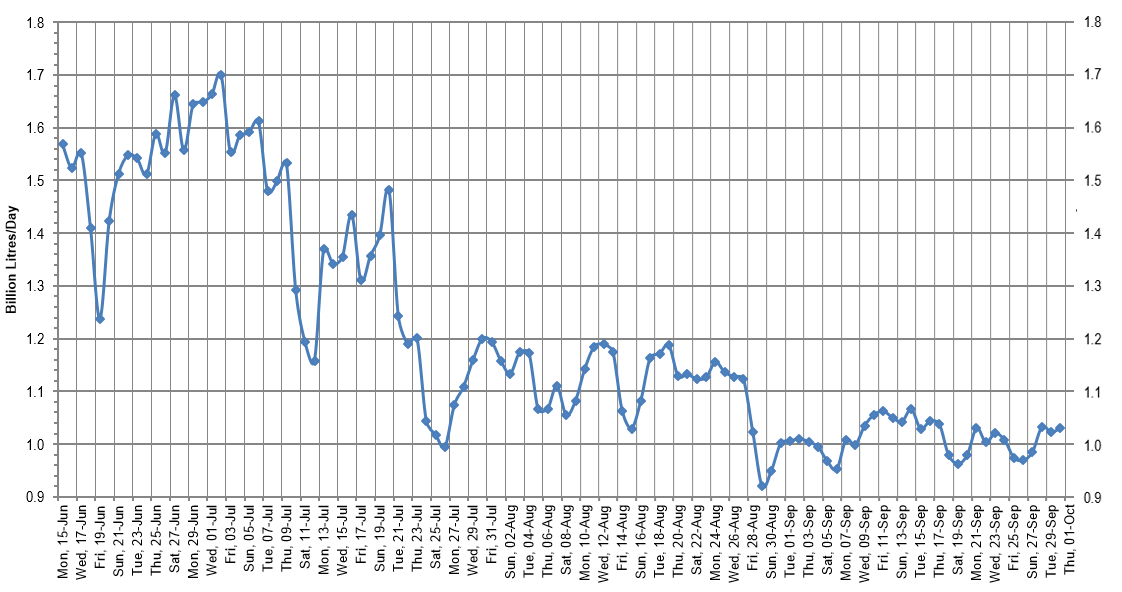 Once the regional district moved to Stage 3 restrictions on July 20, water use plummeted. After averaging 1.4 billion litres of use every day for the previous month, the region hasn’t eclipsed 1.2 billion litres in a day since.