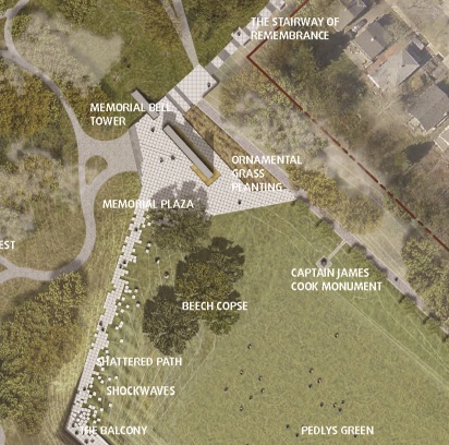The plans include more commemorative designs around the bell tower, including a memorial plaza, a stairway of remembrance and a walkway called “the shattered path”.