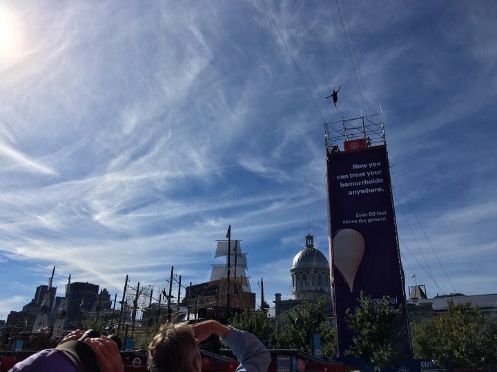 It was quite a show as Robinson, perched over 24 metres in the air, walked across a two-and-a-half centimetre wide webbing with the Old Port as a backdrop.