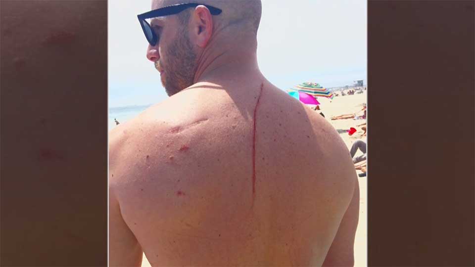 While he managed to swim to shore with only a nasty cut on his back, he says he was bothered later that day by a nagging pain.