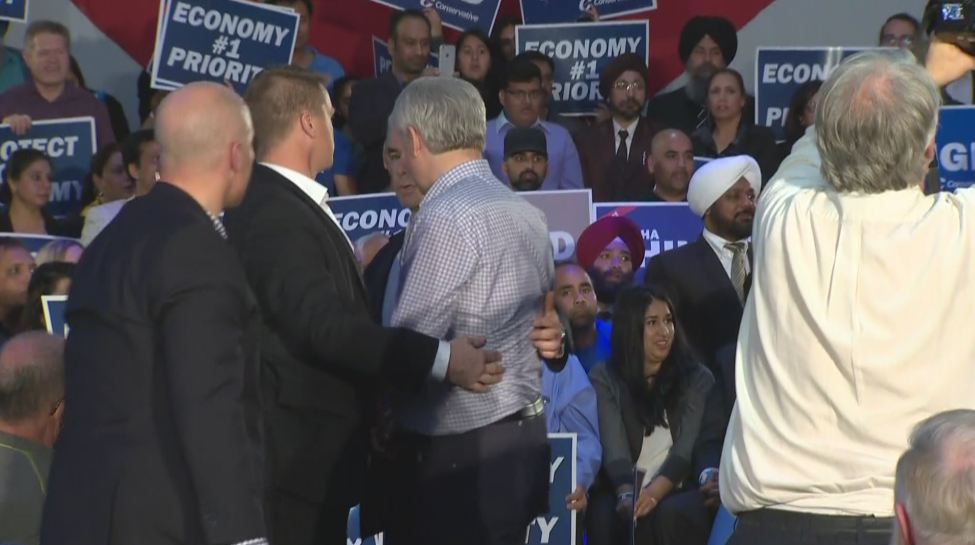 Minutes later, Harper was discussing economic policy when a man attempted to storm the stage from the side.