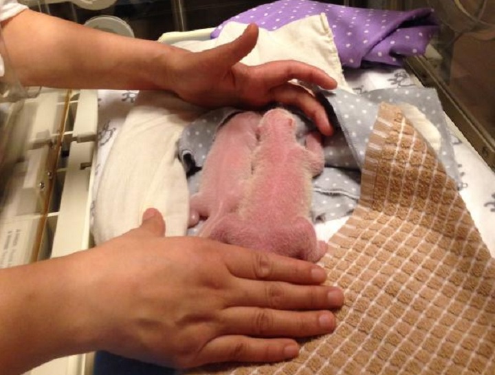Female giant panda Er Shun delivered the first newborn at 3:31 a.m. followed by the second three minutes later.