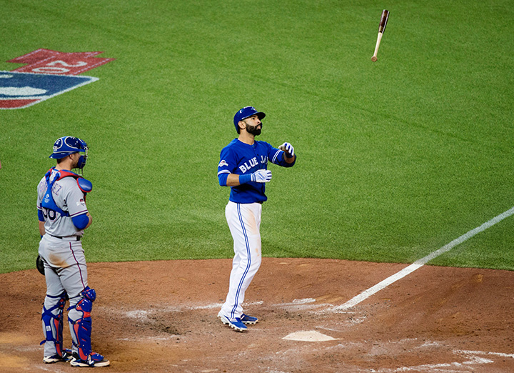 Bautista, also known as Joey Bats, crushed a three-run homer in the seventh inning of Game 5 of the ALDS, putting the Blue Jays ahead of the Texas Rangers 6-3. The 34-year-old outfielder highlighted his handiwork with a monstrous flip of the bat.
