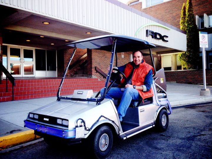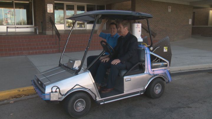As a way to honour both, Red Deer College built its own DeLorean golf cart.