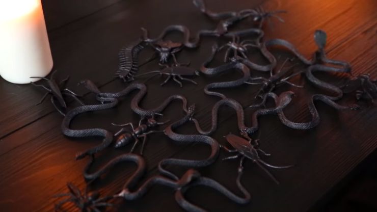 You can probably find close to everything you’ll need there. Even if something doesn’t look exactly like you want it to right out of the bag, a little imagination and creativity goes a long way. Cauchon’s black creepy-crawly place-mats, for instance, called for some super glue and spray paint. Cauchon glued the small snakes together to form a place-mat. They originally looked like this: