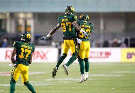 EDMONTON — Derel Walker reeled in three touchdown passes as the Edmonton Eskimos secured first place overall in the CFL and a bye before hosting the West Division final with a 40-22 victory over the Montreal Alouettes on Sunday.