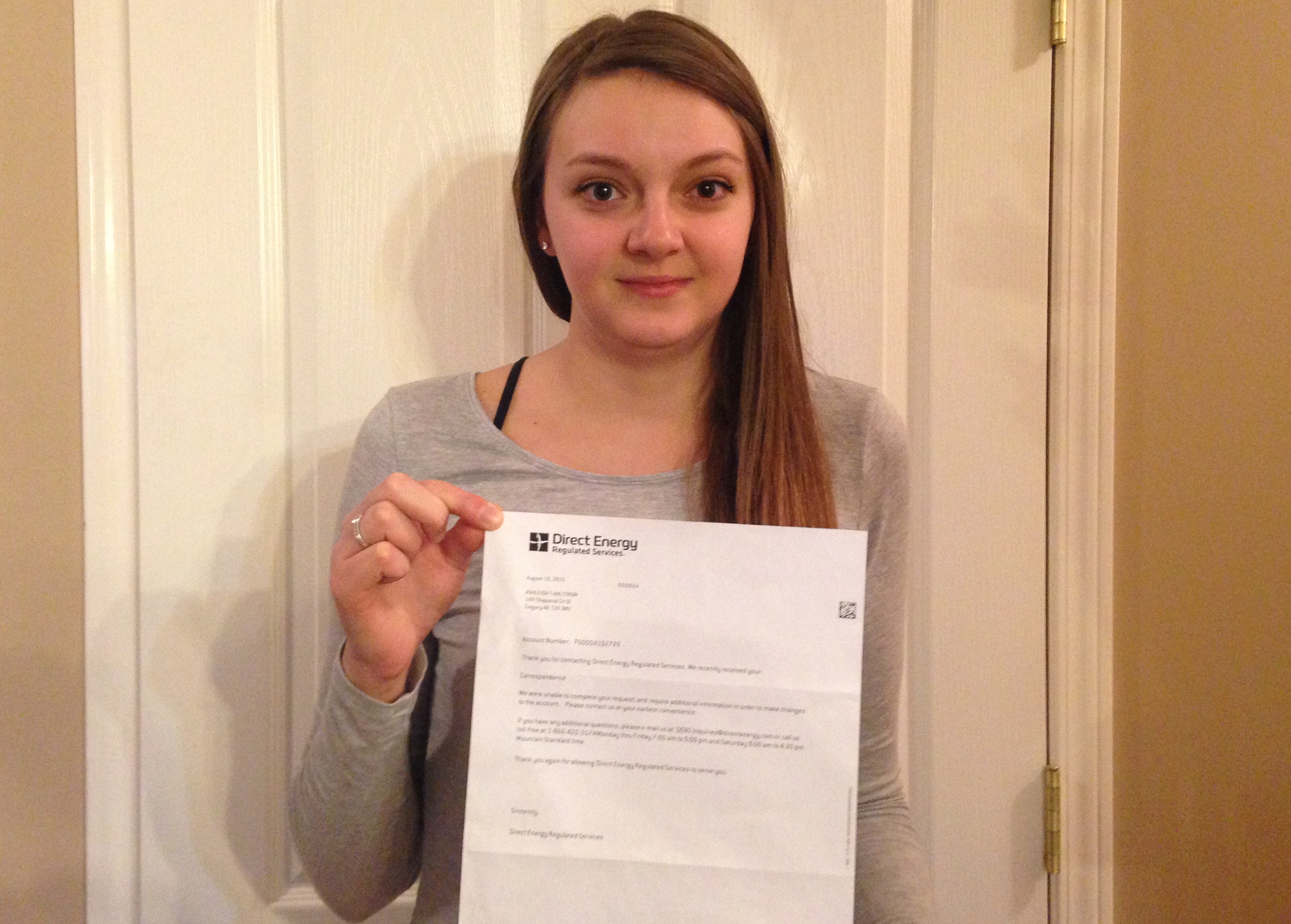 The third-year University of Lethbridge student had registered with Direct Energy after deciding to rent her own home for the first time. When the school year was coming to an end, she gave one months notice to cut her utility services, because she was moving back home to Calgary for the summer. She then received a note on her last bill telling her she would be getting a $121 refund.