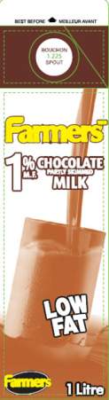 The product was distributed in Nova Scotia and Prince Edward Island. The brand is Farmers 1% Partly Skimmed Chocolate Milk in the 1L size. It has a best before date of DE 2 and a UPC of 0 67997 02056 5.