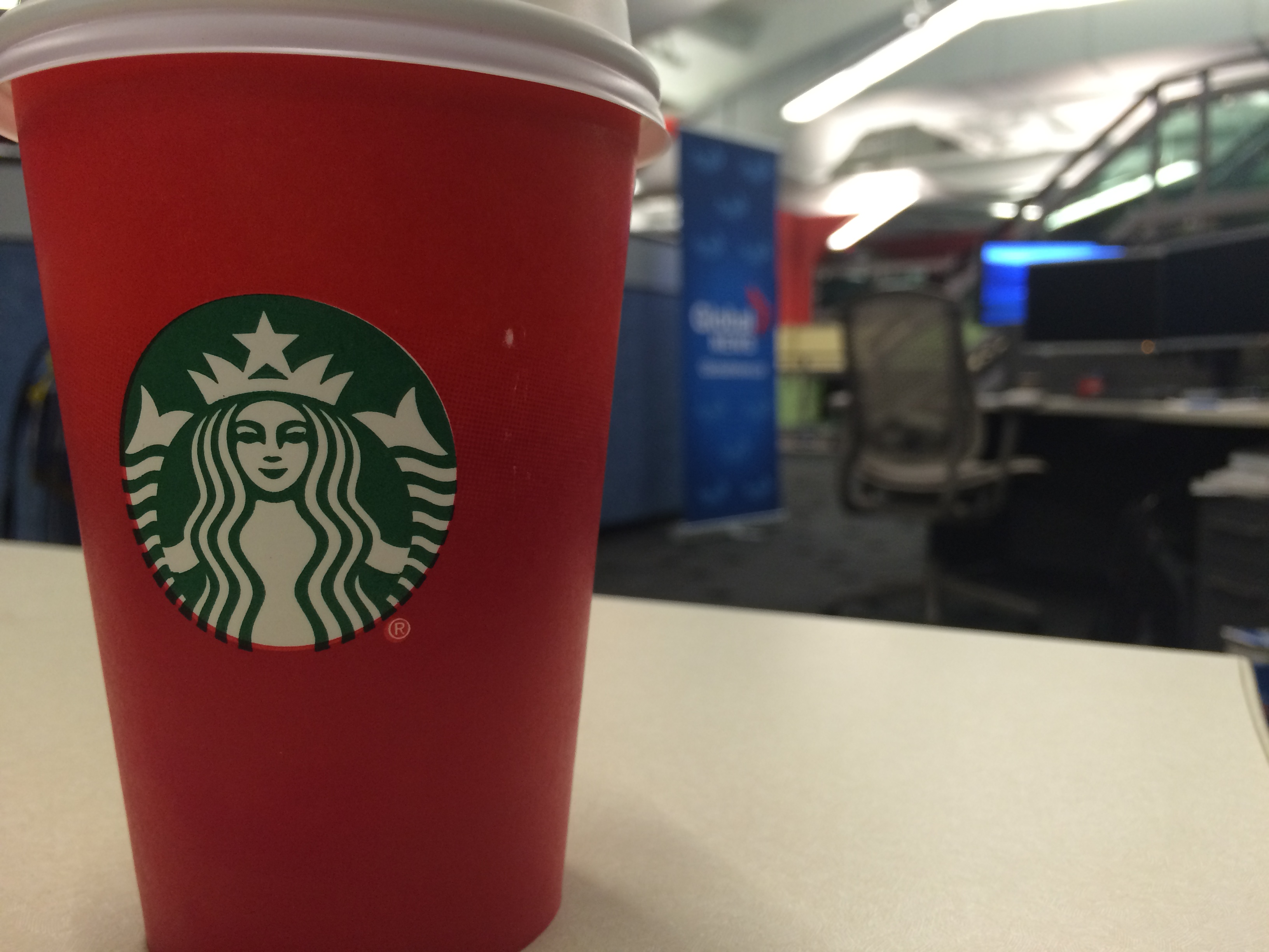 Feuerstein is referring to the coffee chain’s red holiday cups which don’t include the snowflakes, ornaments, reindeer and snowmen of years past.