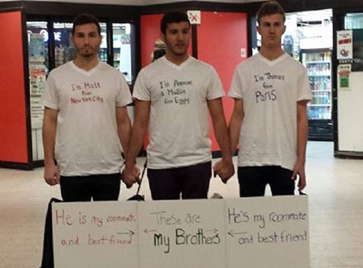 They stood with a sign that read, “He is my roommate and best friend. These are my brothers. They cannot separate us.”