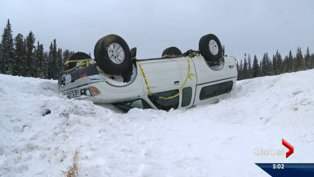 Nearby, two other vehicles were in the deep snow of the centre median, including an overturned pickup truck.