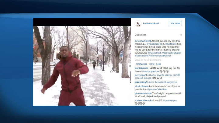 SASKATOON – A winter storm that’s hitting parts of the Prairies is more than a match for comedian Kevin Hart. The entertainer was in Saskatchewan this week on his current comedy tour and posted to Instagram footage of himself and a couple of friends preparing to head out for a five-kilometre run on Saskatoon’s icy sidewalks.