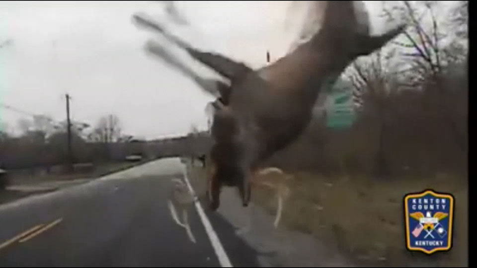 Incredible video shows the moment a Kentucky officer’s cruiser made contact with a deer, sending the animal flying over the vehicle’s hood and scurrying off into the woods.