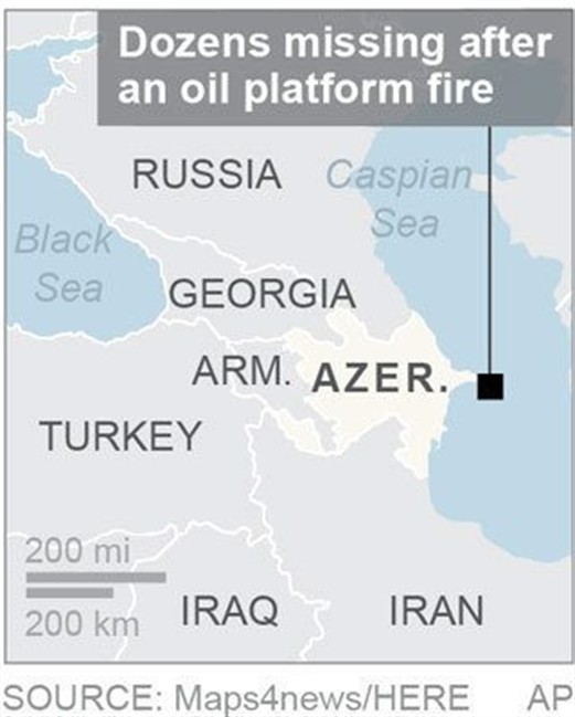 BAKU, Azerbaijan – Azerbaijan’s state oil company SOCAR said Sunday that it was still searching for 29 workers missing after a fire swept through an offshore oil platform.