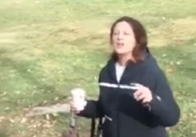 In the video, Slader stands with her purse, umbrella and a cup of coffee, saying Albeshari’s “people have tortured” others.