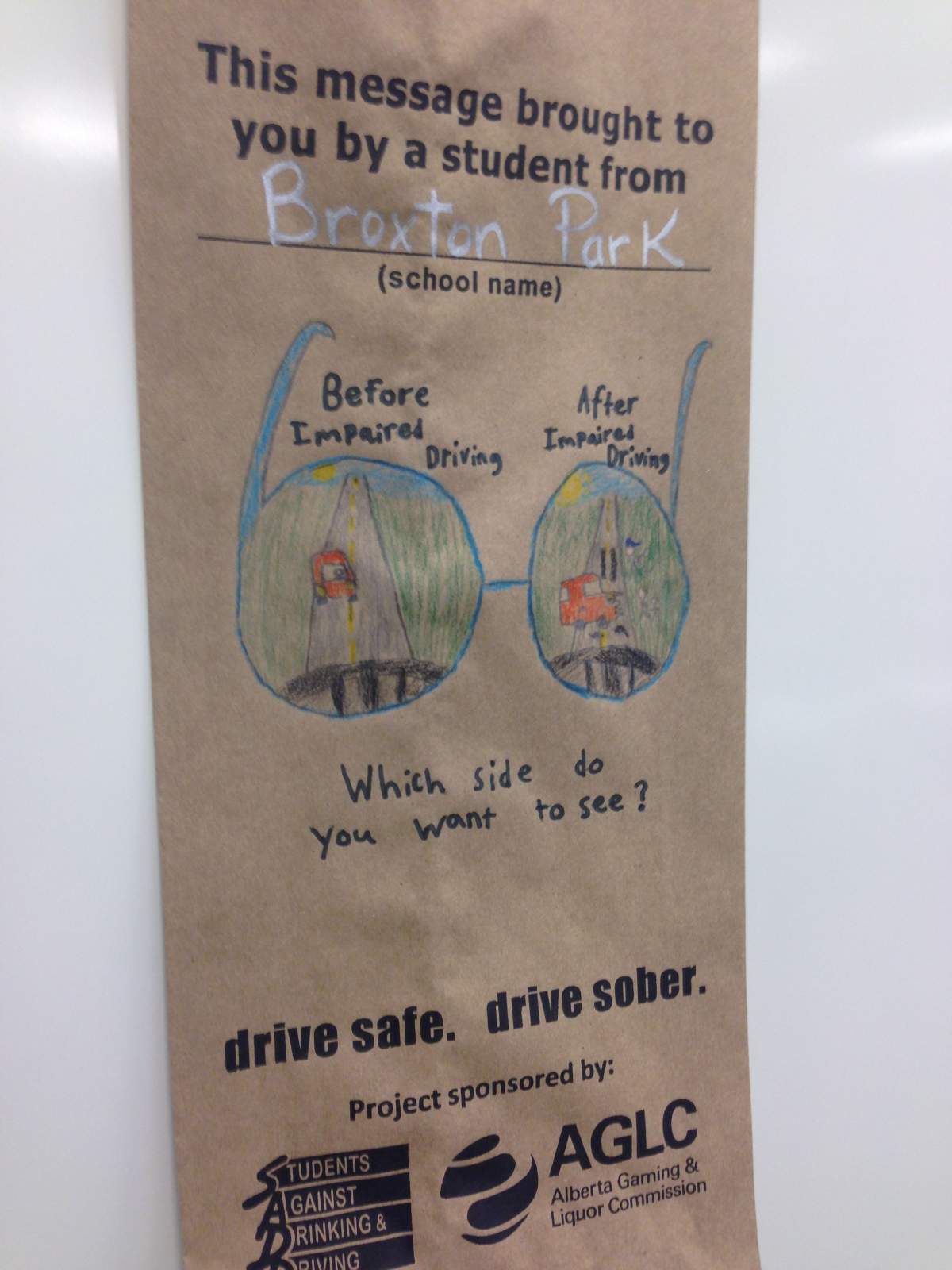 For the fourth year in a row, Students Against Drinking and Driving partnered with the Alberta Gaming and Liquor Commission for a campaign where students from kindergarten to Grade 12 write a personal message about the dangers of impaired driving on a paper liquor bag.