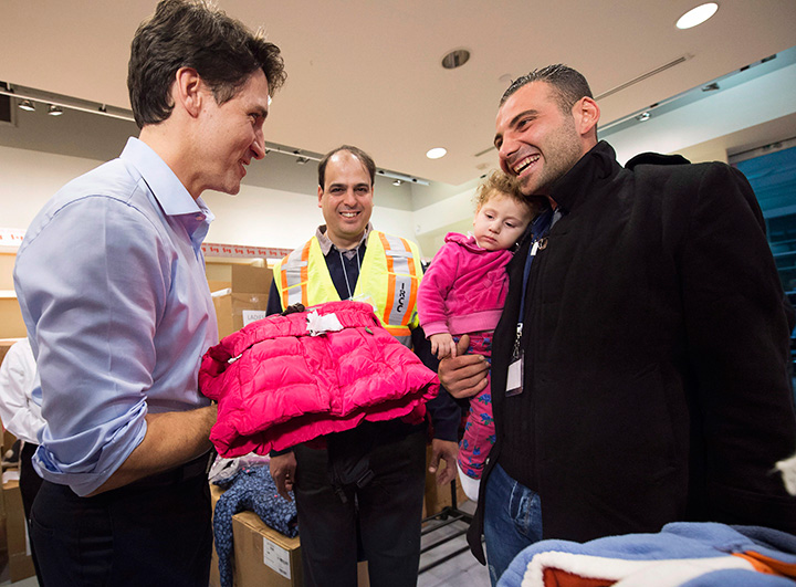 The prime minister, who was joined by the ministers of immigration, health and defence, Toronto Mayor John Tory, Ontario Premier Kathleen Wynne and the opposition immigration critics, thanked the staff and volunteers helping to process and welcome the 163 refugees ahead of the arrival of the military aircraft.
