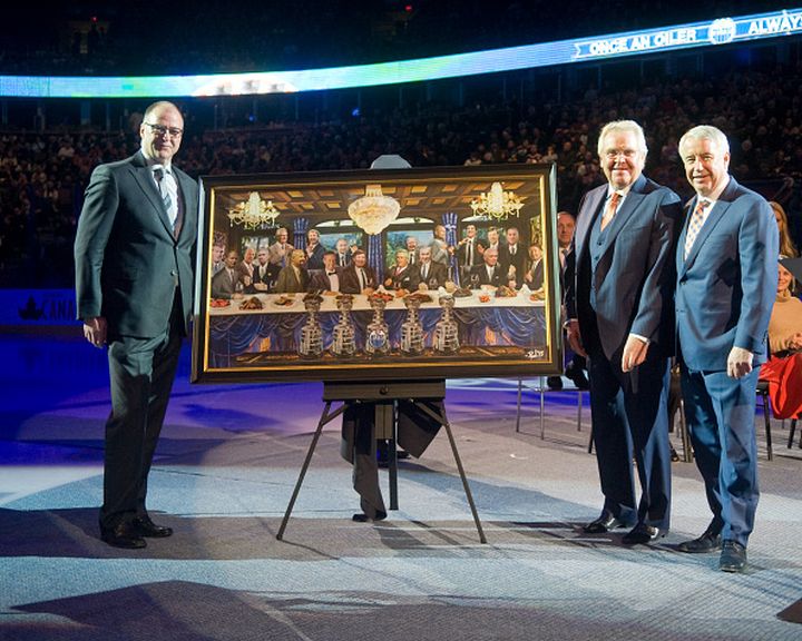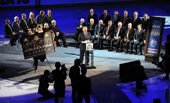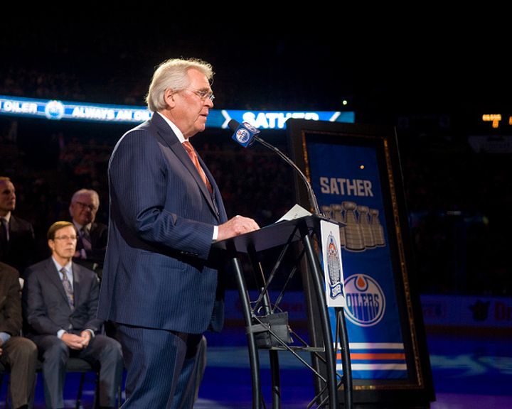 Sather was joined at centre ice by his wife, children, grandchildren and several Oilers alums to as his banner was raised to the rafters.