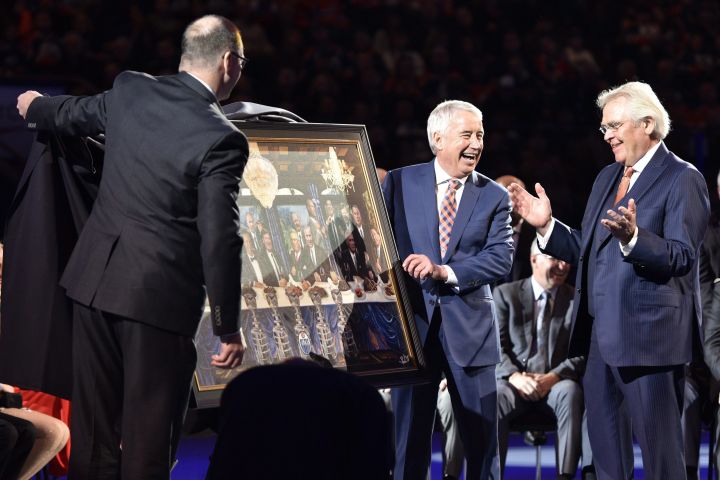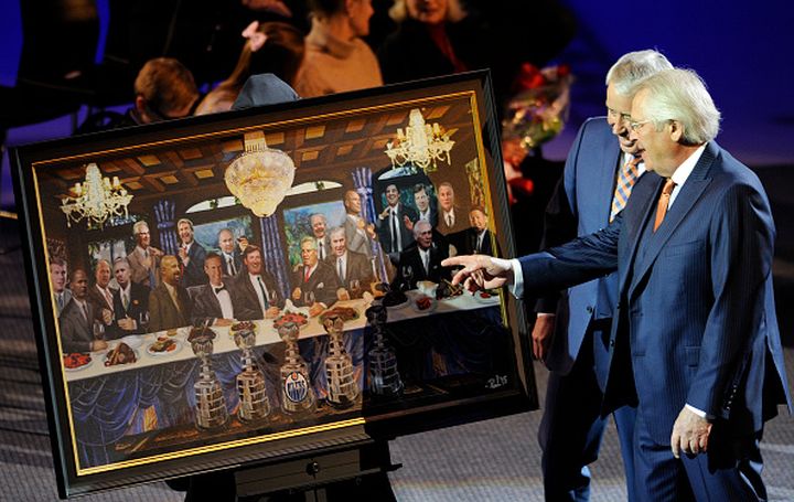 A video of his time with the team was played on the jumbotron. Sather also presented with an original painting from the tribute gala, which was held in his honour Thursday night. He was also given a framed miniature version of his banner.