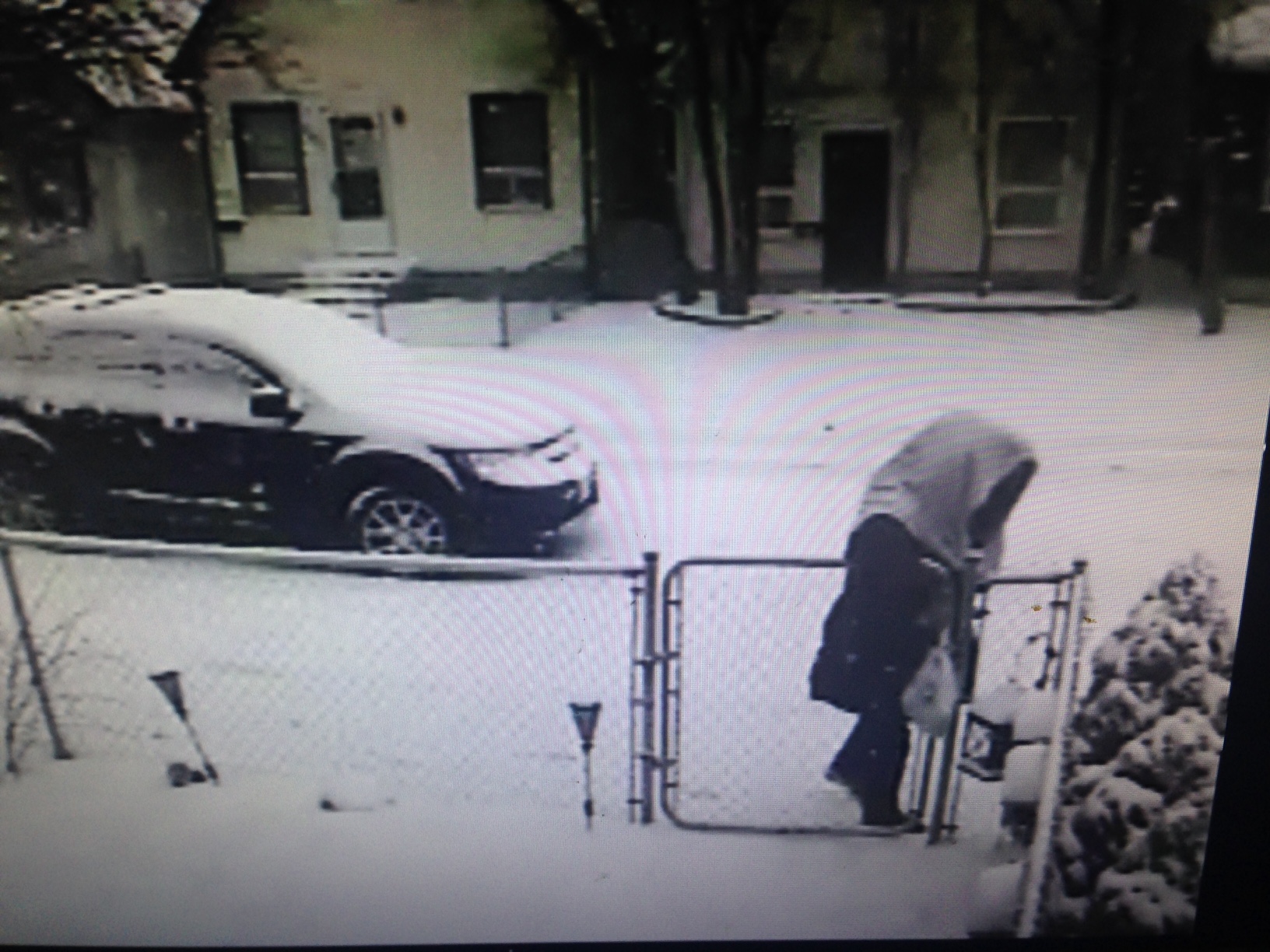 This time, the video shows a person with their head covered and draped in a blanket or towel of some sort, walking up to Geiger’s yard and placing a bag over her fence.