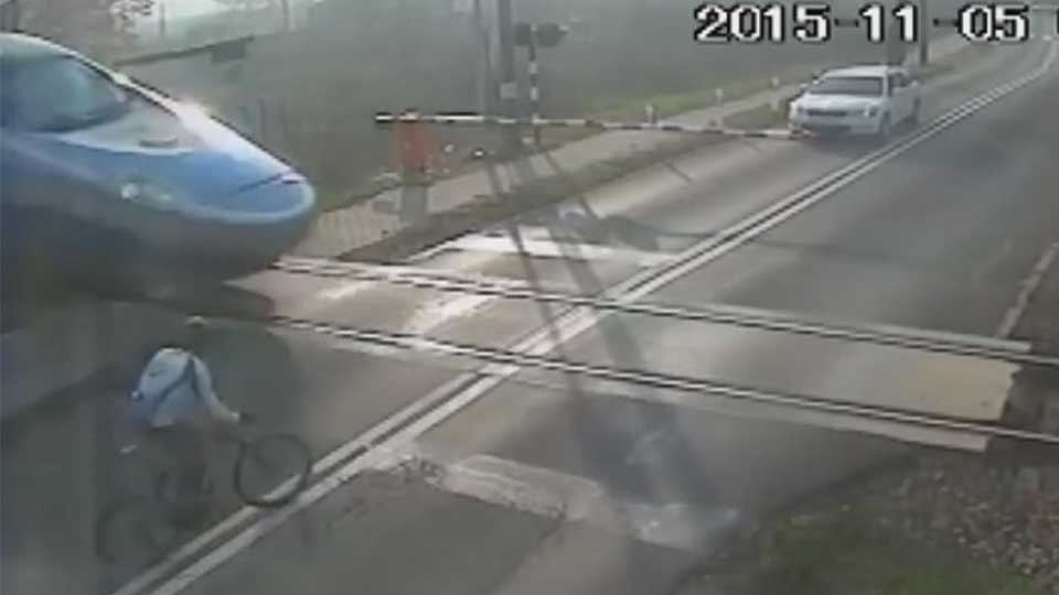 A cyclist was caught on Polish Railway CCTV cameras on Nov. 5 as he circumvented a lowered barrier at a railway crossing and was hit by an approaching high-speed train.