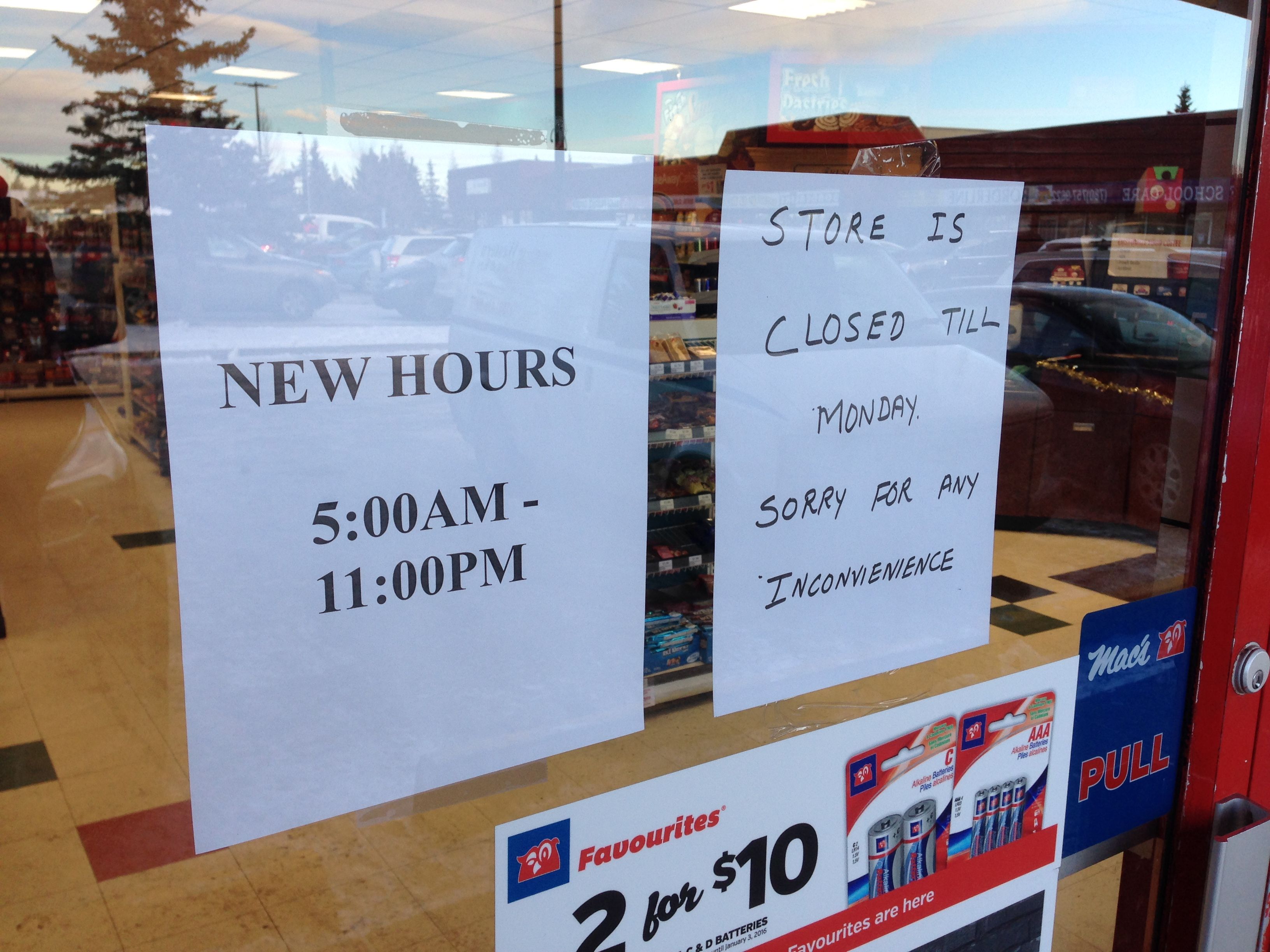 The Mac’s store on 82 Street and 32 Avenue in south Edmonton has permanently changed its hours to 5 a.m. to 11 p.m. It will no longer be open 24 hours a day.