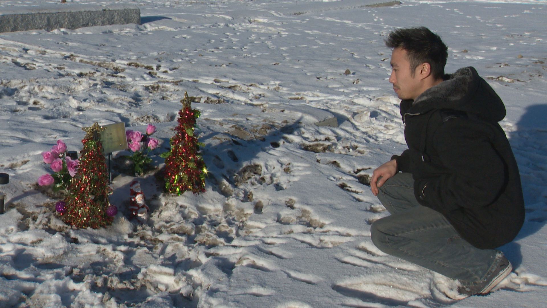 CALGARY – Two small Christmas trees mark the grave site of Julie Tran. Julie’s little brother is just trying to survive the holiday season without her.