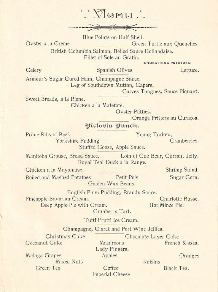 WINNIPEG — Forget turkey, stuffing, and cranberry sauce; a Christmas dinner menu from a once luxurious Winnipeg hotel, gives a glimpse of how people dined more than a century ago.