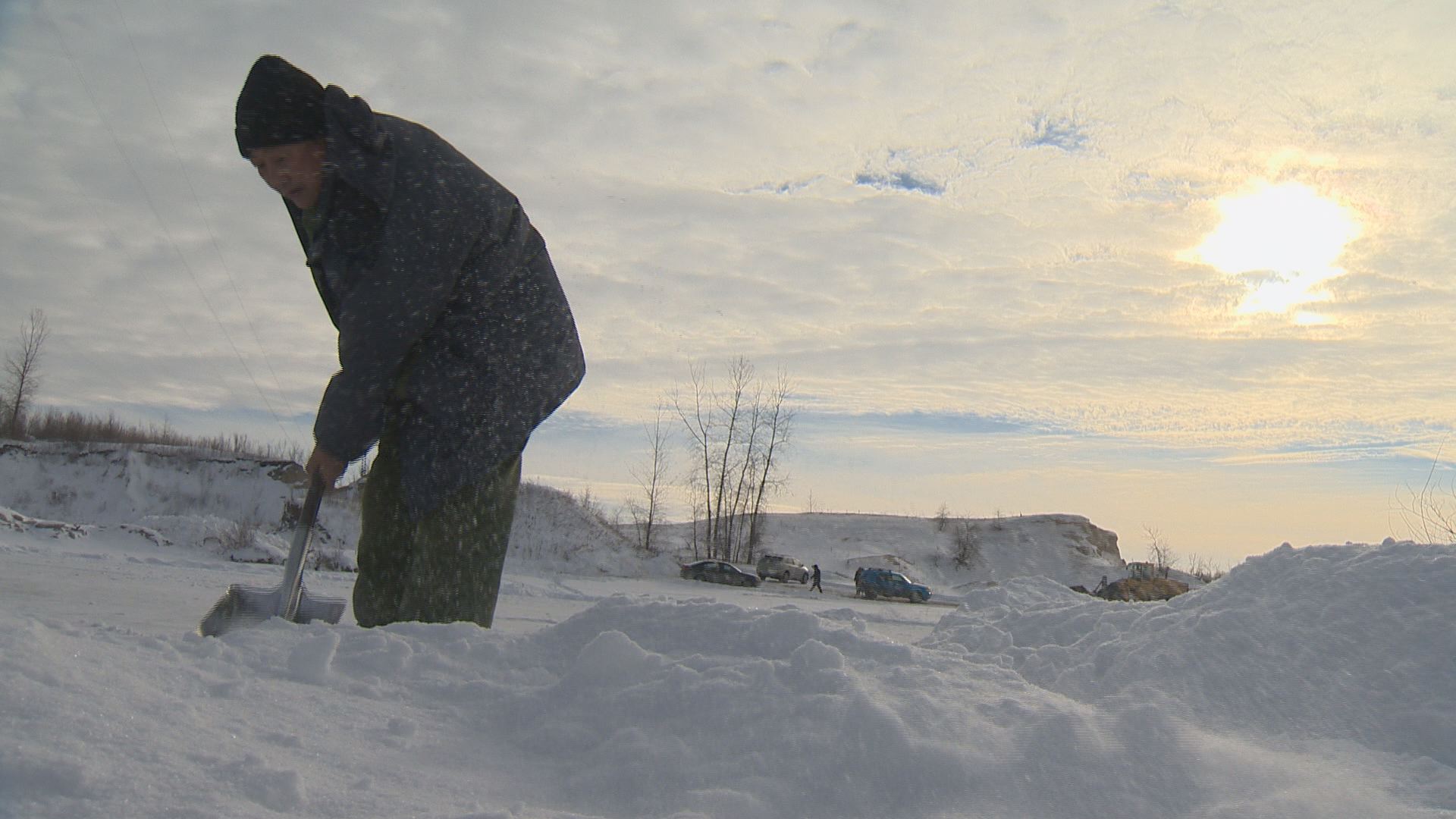 So the team of 40 artists have to drive 30 minutes away to a gravel pit near Birds Hill Provincial Park to first shovel snow off of a pond, then cut the ice into chunks and haul it to Winnipeg.