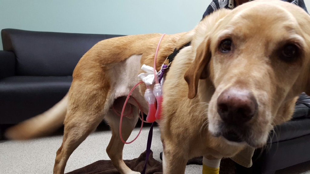 The 9-year-old Yellow Lab’s kidney was abscessed, and needed to be removed.
