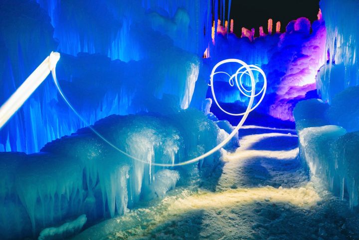 Amid the archways, there’s also a fountain, a waterfall, a fireplace, a throne room and two slides. LED lights buried in the ice illuminate the castle in different colours at night.