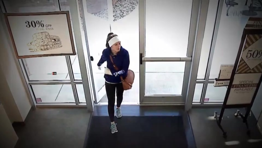 Security camera footage recorded a woman entering a store and forcing two employees into a back room at gunpoint, where she zip-tied their hands.