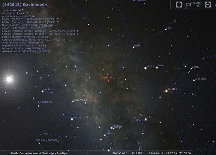 Now, don’t go looking for 342843 Davidbowie just yet. First off, the far-off piece of space rock is only currently visible in the southern hemisphere, found between the constellations Sagittarius and Scorpius (we get to see those constellations in the summer). Second, and most important, is that it’s not visible using an amateur telescope.