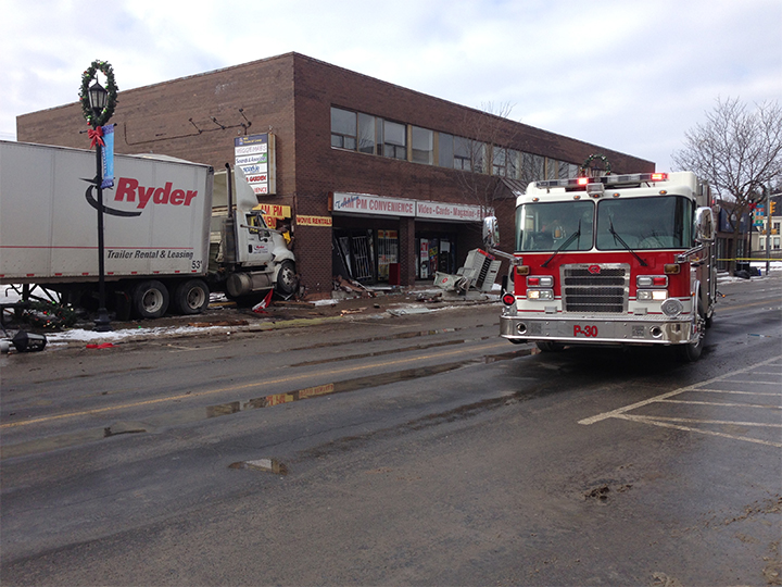 Ontario Provincial Police said the truck was travelling northbound on Queen Street at about 11 a.m. in Tottenham when for unknown reasons it veered into the southbound lane, drove over the sidewalk and travelled more than 20 metres before striking a ReMax building, a post office and crashing into a convenience store.