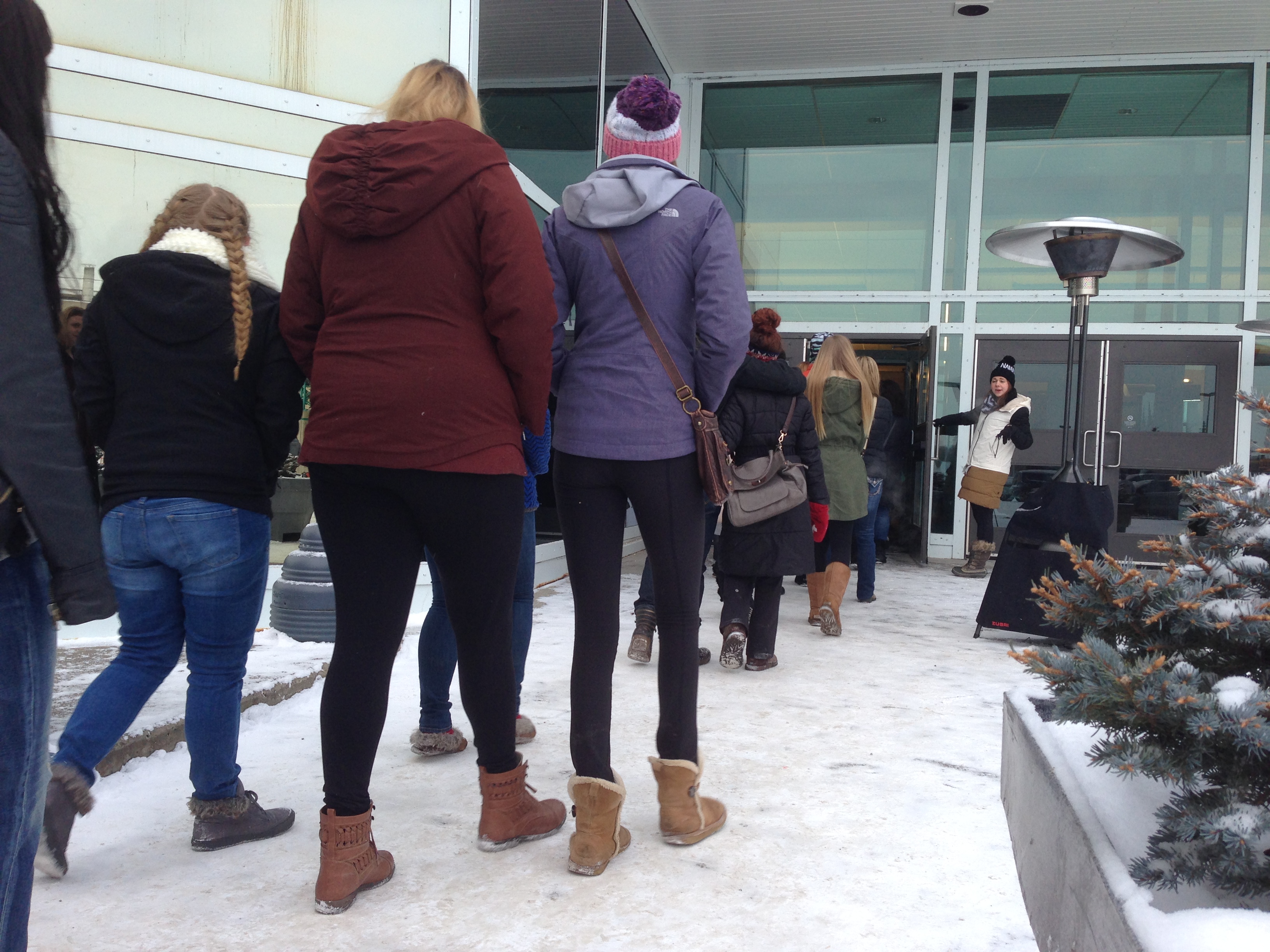 The line extended outside, where the temperature was a chilly -17°C. Lululemon told customers to expect to wait up to an hour outdoors before being able to move inside, and discouraged parents from bringing young children.