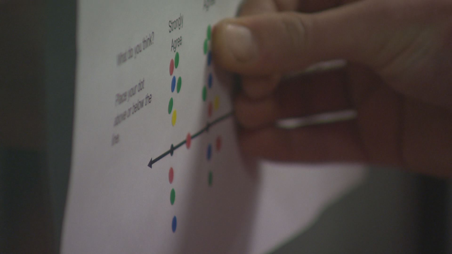 Papers with ideas on changing the act were attached to windows in a room in the library. Participants placed stickers on accompanying scales based on how much or little they agreed a particular idea.