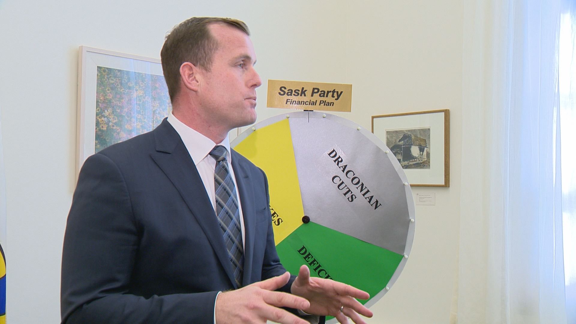 “No family in Saskatchewan should have to spin this wheel and take a gamble on their future,” said NDP finance critic Trent Wotherspoon, who didn’t want to take a crack at the game either.