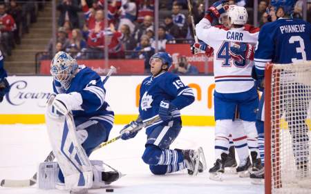 But it took the Habs just 1:41 to end the festivities with Desharnais beating Reimer on the Habs’ first shot after the Leafs failed to clear their zone and Dale Weise, attracting three Toronto players in the slot, found Desharnais alone in the face-off circle to the right of Reimer. It was his ninth of the season.
