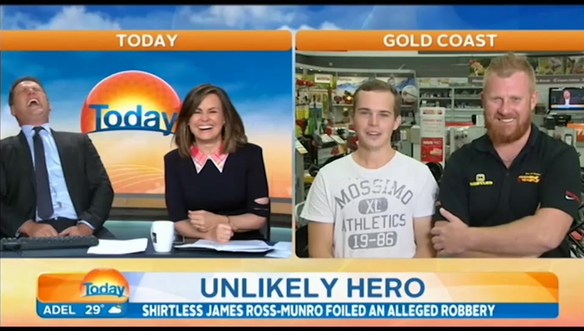 The hosts could barely contain themselves during the live interview, especially when Ross-Munro said the only gym he goes to is “Jim Beam”.