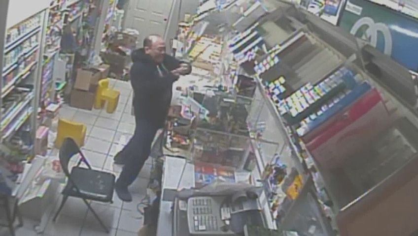 Tho Banh can be seen on his own store security camera footage, swinging a crowbar he had picked up. But instead of hitting the robber, he was smashing his own store shelving, possibly in an effort to scare the thief.
