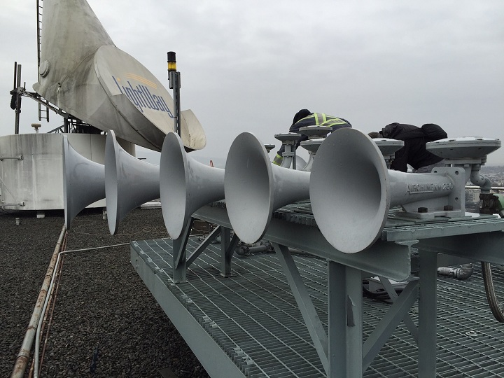Marshall maintains the 10 ‘Heritage Horns,’ which use 115 pounds of air to blast the notes in six seconds. He keeps them in-tune and a digital clock keeps them on-time.
