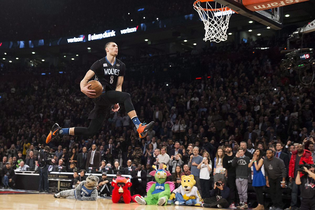 LaVine won it with a flying between-the-legs one-handed dunk with a takeoff from just inside the free-throw line. Cue another 50 and a court invasion from fellow players.