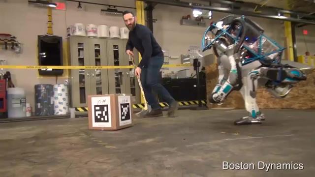 Atlas, who is about 5’9″ and weighs about 180 lbs., is designed to work outdoors and inside buildings. Its LIDAR (Light Detection and Ranging) technology — which is used in mapping — allows the robot to detect an obstacle and estimate its size as well as its distance. So that’s why he can pick up the box every time it’s knocked down.