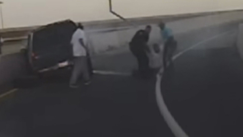The dash-camera video from McGinley’s car shows the Suburban’s front, driver’s side smashed against the concrete barrier and some smoke coming from the engine compartment. McGinley is first on scene and can be seen breaking out the passenger side window with his baton.